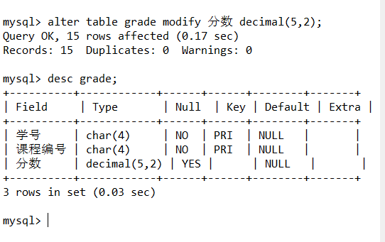 2,使用SQL语句ALTER TABLE修改grade表的“分数”列,使其数据类型为decimal(5,2)。