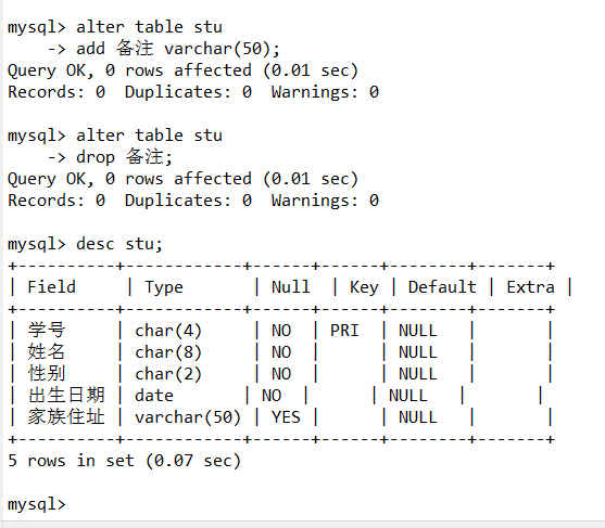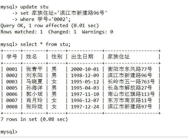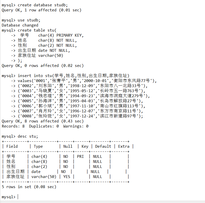 mysql> insert into stu(学号,姓名,性别,出生日期,家族住址)