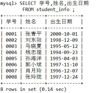 (1)在student_info表中,查询每个学生的学号、姓名、出生日期信息。