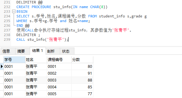 使用CALL命令执行存储过程stu_info,其参数值为'张青平':
