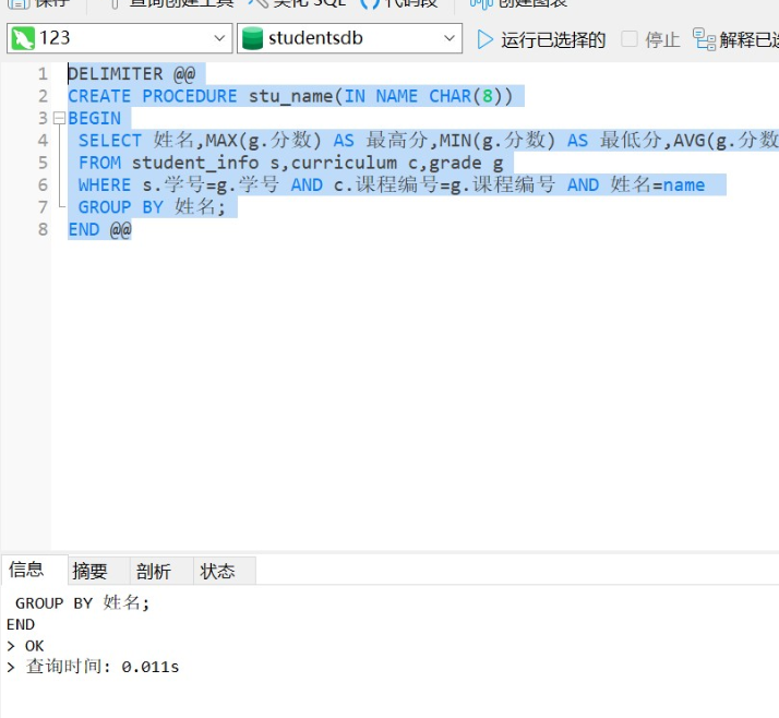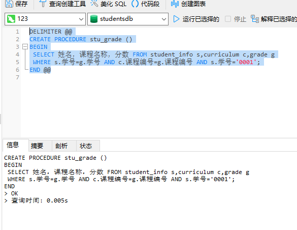 1.输入以下代码,创建存储过程stu_info,执行时通过输入姓名,可以查询该姓名的学生的各科成绩。