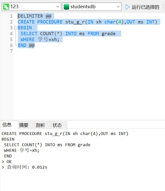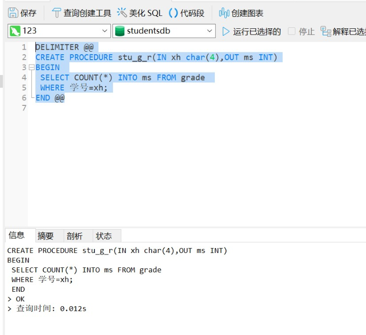 CREATE PROCEDURE stu_g_r(IN xh char(4),OUT ms INT)