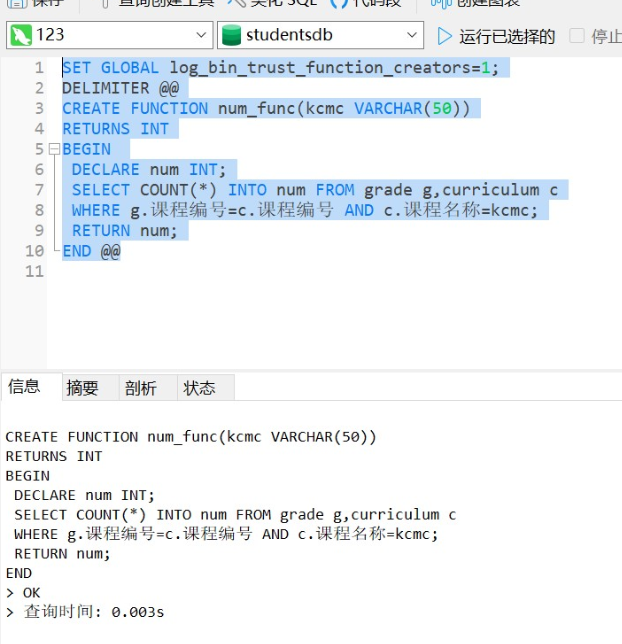 ¥(2)执行存储函数num_func,查看“C语言程序设计”选课人数。