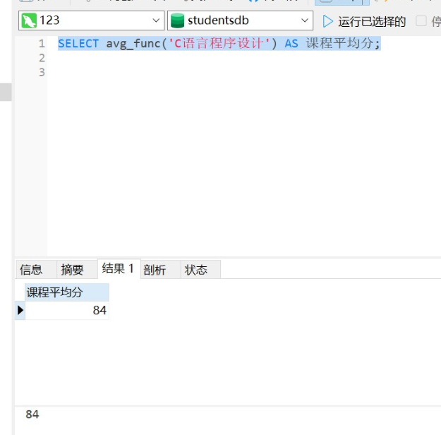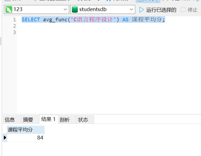 SELECT avg_func('C语言程序设计') AS 课程平均分;