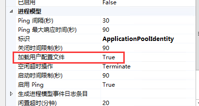 IIS=>应用程序池=>高级设置=>进程模型=>加载用户配置文件 改为True