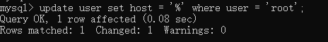 update user set host = '%' where user = 'root';