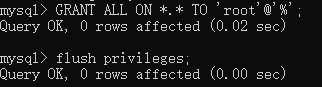 命令:grant all privileges on root.* to 'root'@'%';