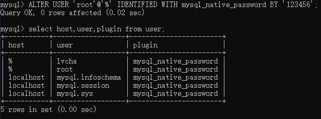 ALTER USER 'root'@'%' IDENTIFIED WITH mysql_native_password BY '123456';
