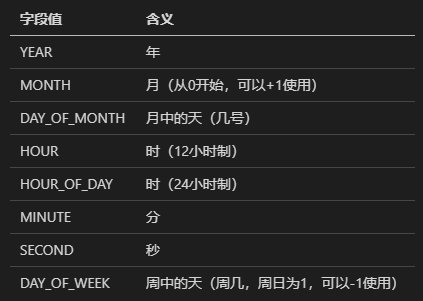 public int get(int field):返回给定日历字段的值。public void set(int field, int value):将给定的日历字段设置为给定值。public abstract void add(int field, int amount):根据日历的规则,为给定的日历字段添加或减去指定的时间量。public Date getTime():返回一个表示此Calendar时间值(从历元到现在的毫秒偏移量)的Date对象。