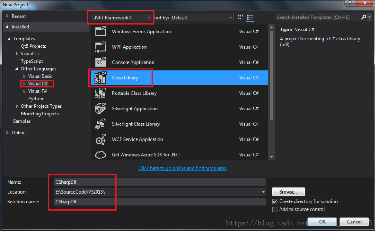 1.打开VS2013,新建一个C#的Class Library项目(这里选择的是.Net Framework 4),项目名为CSharpDll
