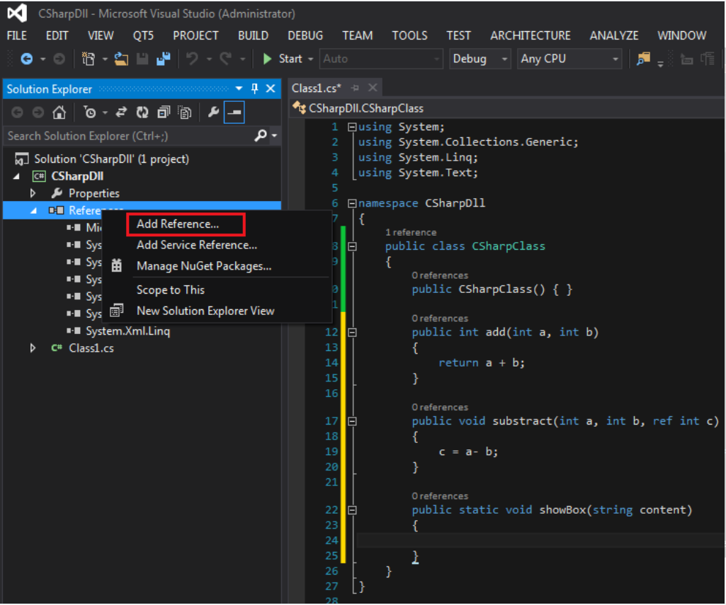 里面包含一个加法add,一个减法substract(为了测试指针,所以在减法的返回类型是void,而把计算结果通过ref参数c给返回),一个showBox方法(里面采用C#的MessageBox对话框显示用户输入的参数字串)
