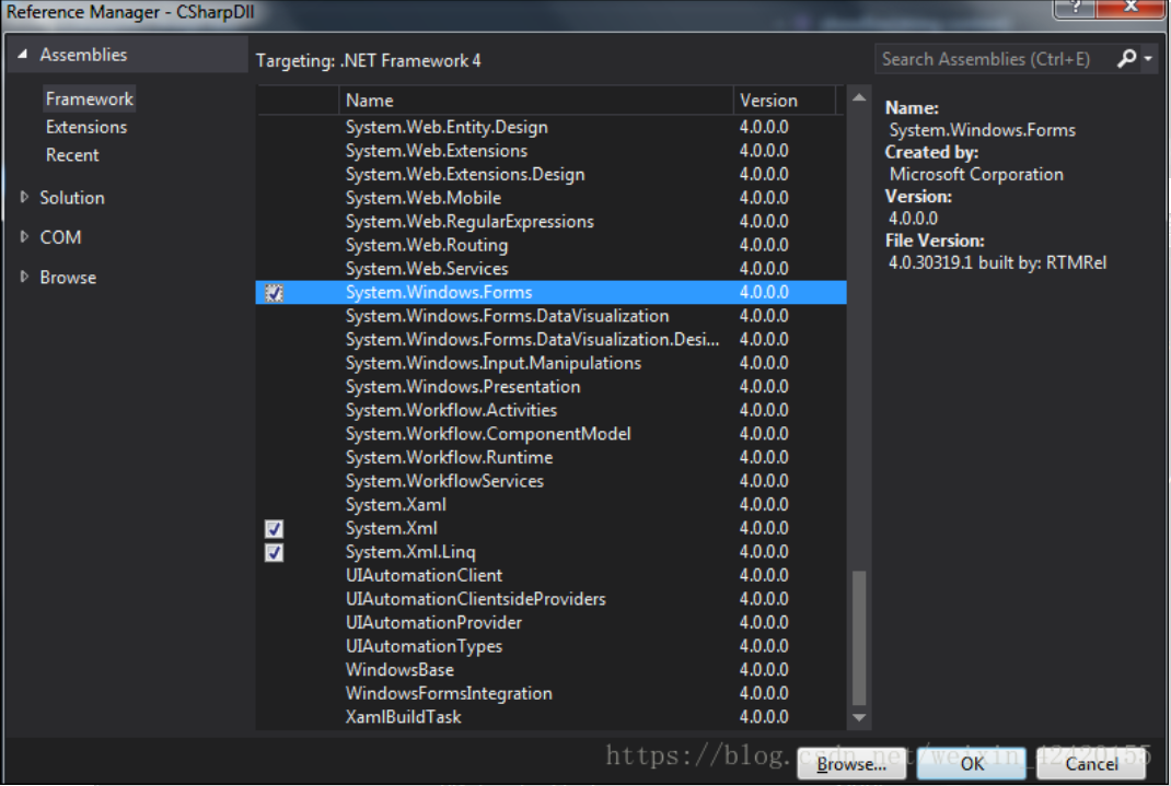 2.由于默认没有引入Forms等UI库,先在reference中添加引用System.Windows.Forms以便可以在测试中使用MessageBox等