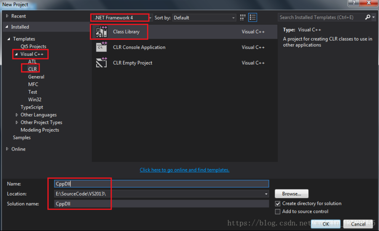 5.关闭CSharpDll项目,另外新建一个C++ CLR类型的Class Library项目(选择与C#项目相同的.Net Framework 4),项目名称为CppDll
