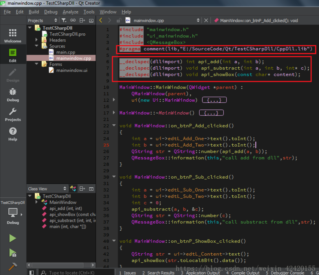 第一点是需要在mainwindow.cpp文件前通过#pragma comment(lib,“lib文件的绝对路径”),这里的lib文件的绝对路径需根据CppDll.lib的实际位置进行设置(在这里本机上为'E:/SourceCode/Qt/TestCSharpDll/CppDll.lib')(绝对路径的分隔符最好采用'/',而不是'\')