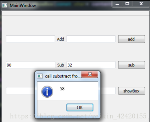 13.分别对add,sub和showBox按钮的clicked信号进行槽函数编写,其调用对应的api_add,api_substract和api_showBox函数,需要注意两点: