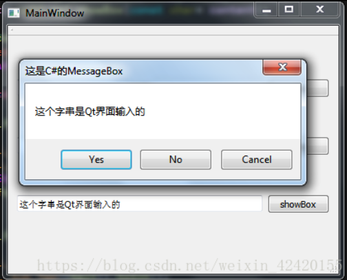 15.执行TestCSharpDll.exe,输入add函数的两个加法参数,substract函数的两个减法参数,以及输入showBox的QString参数(这里是QString,在槽函数里面会通过QString的toLocal8Bit().data()函数转换为char*参数)进行测试,可看出调用成功,并且在showBox中,弹出的对话框标题是CSharpDll中写的“这是C#的MessageBox”,而在内容中则是Qt中输入的“这个字串是Qt界面输入的”