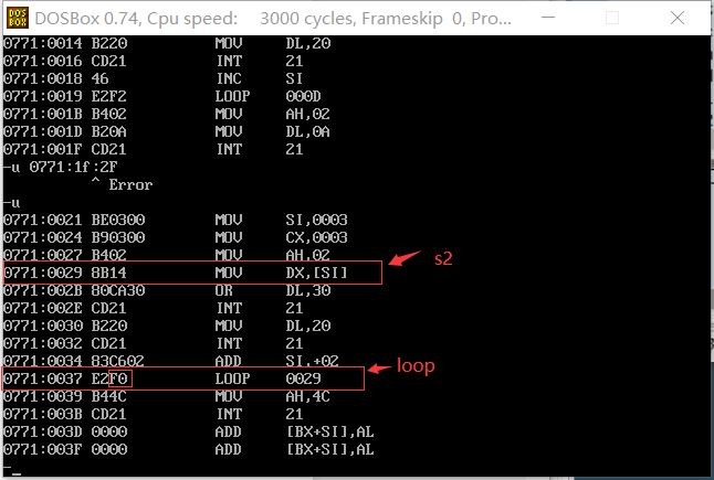 ② line44,汇编指令 loop s2 跳转时,是根据位移量跳转的。通过debug反汇编,查看其机器码,分析其跳转的位移量是多少?(位移量数值以十进制数值回答)从CPU的角度,说明是如何计算得到跳转后标号s2其后指令的偏移地址的。