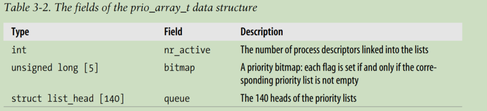 the kernel must preserve a lot of data for every runqueue in the system; however, the main data structures of a runqueue are the lists of process descriptors belonging to the runqueue; all these lists are implemented by a single prio_array_t data structure.