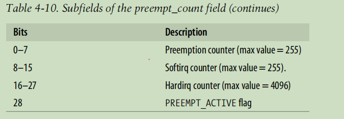 The in_interrupt() macro checks the hardirq and softirq counters in the current_thread_info()->preempt_count field. If either one of these two counters is positive, the macro yields a nonzero value, otherwise it yields the value zero.
