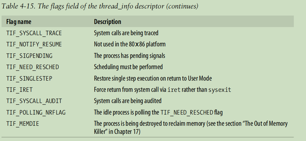 A few flags are used to keep track of pending process switch requests, of pending sigals, and of single step execution; they are stored in the flags field of the thread_info descriptor.