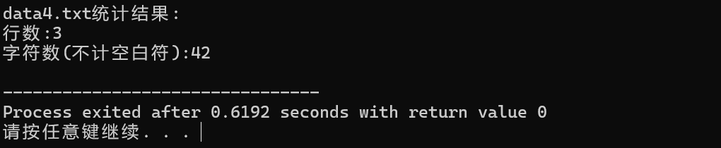 #include<stdio.h> #define N 30 int main(){ char s[N]; int i,n; int line=0,word=0; FILE *fin; fin = fopen("data4.txt","r"); if(!fin){ printf("fail to open the file"); return 0; } while(!feof(fin)){ fgets(s,N,fin); line++; i = 0; while(s[i]!='\0'){ if(s[i]!=' '&&s[i]!='\n') word++; i++; } } fclose(fin); printf("data4.txt统计结果:\n"); printf("行数:%d\n",line); printf("字符数(不计空白符):%d\n",word); return 0; }