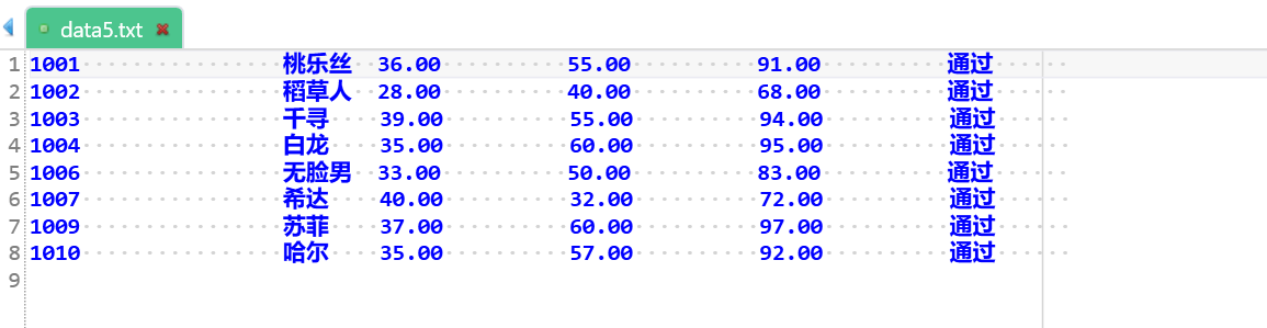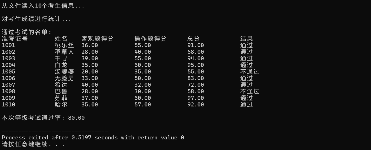 #include <stdio.h> #include <string.h> #define N 10 typedef struct { long id; char name[20]; float objective; float subjective; float sum; char result[10]; } STU; void read(STU st[], int n); void write(STU st[], int n); void output(STU st[], int n); int process(STU st[], int n, STU st_pass[]); int main() { STU stu[N], stu_pass[N]; int cnt; double pass_rate; printf("从文件读入%d个考生信息...\n", N); read(stu, N); printf("\n对考生成绩进行统计...\n"); cnt = process(stu, N, stu_pass); printf("\n通过考试的名单:\n"); output(stu, N); write(stu_pass, cnt); pass_rate = 1.0 * cnt / N; printf("\n本次等级考试通过率: %.2f\n", pass_rate * 100); return 0; } void output(STU st[], int n) { int i; printf("准考证号\t姓名\t客观题得分\t操作题得分\t总分\t\t结果\n"); for(i = 0; i < n; i++) printf("%ld\t\t%s\t%.2f\t\t%.2f\t\t%.2f\t\t%s\n", st[i].id, st[i].name, st[i].objective,st[i].subjective, st[i].sum, st[i].result); } void read(STU st[], int n) { int i; FILE *fin; fin = fopen("examine.txt", "r"); if(!fin) { printf("fail to open file\n"); return; } while(!feof(fin)) { for(i = 0; i < n; i++) fscanf(fin, "%ld %s %f %f", &st[i].id, st[i].name, &st[i].objective, &st[i].subjective); } fclose(fin); } void write(STU s[], int n) { int i; FILE *fp; fp = fopen("data5.txt", "w"); if(fp == NULL){ printf("fail to open file to write"); return; } for(i = 0;i < n; i++) fprintf(fp, "%-20ld%-8s%-15.2f%-15.2f%-15.2f%-10s\n",s[i].id,s[i].name, s[i].objective, s[i].subjective, s[i].sum, s[i].result); fclose(fp); } int process(STU st[], int n, STU st_pass[]) { int i, j = 0, cnt = 0; for(i = 0;i < n; i++){ st[i].sum = st[i].objective + st[i].subjective; if(st[i].sum >= 60){ strcpy(st[i].result, "通过"); st_pass[j++] = st[i]; cnt++; } else { strcpy(st[i].result, "不通过"); } } return cnt; }