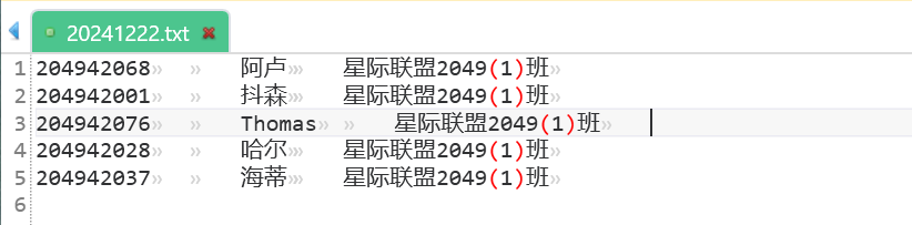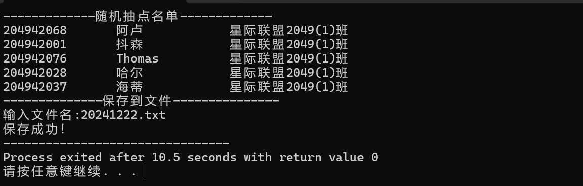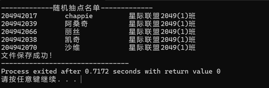 #include<stdio.h> #include<time.h> #include<stdlib.h> #include<string.h> #define N 1000 typedef struct student{ int id; char name[N]; char cla[N]; }STU; void read (STU st[]); void process (STU st[]); int main(){ STU s[80]; read(s); process(s); return 0; } void read (STU st[]){ int i; FILE *fp; fp = fopen("list.txt","r"); if(fp == NULL){ printf("fail to open the file"); return; } while(!feof(fp)){ for (i = 0;i < 80; i++){ fscanf(fp,"%ld %s %s",&st[i].id,st[i].name,st[i].cla); } } fclose(fp); } void process (STU st[]){ srand(time(NULL)); int i,j,t; int temp,count = 0; int sel[5]; while(count < 5){ int sign = 1; temp = rand() % 80; for(i = 0;i < count; i++){ if(sel[i] == temp) count--; } sel[i] = temp; count++; } for(i = 0; i < 5; i++) for(j = 0; j < 4-i; j++){ if(sel[i] > sel[i+1]){ t = sel[i]; sel[i] = sel[i+1]; sel[i+1] = t; } } printf("-------------随机抽点名单-------------\n"); for(i = 0;i < 5; i++){ printf("%d\t%s\t\t%s\t\n",st[sel[i]].id,st[sel[i]].name,st[sel[i]].cla); } time_t rawtime; struct tm *timein; char name[100]; time(&rawtime); timein = localtime(&rawtime); strftime(name,sizeof(name),"%Y%m%d.txt",timein); FILE *fp; fp = fopen(name,"w"); if(fp == NULL){ printf("fail to open the file"); return; } for(i = 0;i < 5; i++){ fprintf(fp,"%d\t\t%s\t\t%s\t\n",st[sel[i]].id,st[sel[i]].name,st[sel[i]].cla); } fclose(fp); printf("文件保存成功!"); }