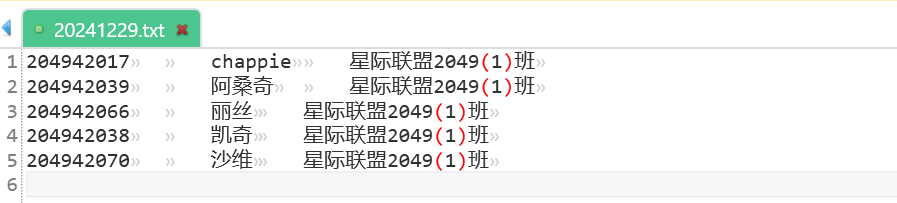 #include<stdio.h> #include<time.h> #include<stdlib.h> #include<string.h> #define N 1000 typedef struct student{ int id; char name[N]; char cla[N]; }STU; void read (STU st[]); void process (STU st[]); int main(){ STU s[80]; read(s); process(s); return 0; } void read (STU st[]){ int i; FILE *fp; fp = fopen("list.txt","r"); if(fp == NULL){ printf("fail to open the file"); return; } while(!feof(fp)){ for (i = 0;i < 80; i++){ fscanf(fp,"%ld %s %s",&st[i].id,st[i].name,st[i].cla); } } fclose(fp); } void process (STU st[]){ srand(time(NULL)); int i = 0,temp,count = 0; int sel[5]; char time[1000]; while(count < 5){ int sign = 1; temp = rand() % 80; for(i = 0;i < count; i++){ if(sel[i] == temp) count--; } sel[i] = temp; count++; } printf("-------------随机抽点名单-------------\n"); for(i = 0;i < 5; i++){ printf("%d\t%s\t\t%s\t\n",st[sel[i]].id,st[sel[i]].name,st[sel[i]].cla); } printf("--------------保存到文件---------------\n"); printf("输入文件名:"); scanf("%s",time); FILE *fp; fp = fopen(time,"w"); if(fp == NULL){ printf("fail to open the file"); return; } for(i = 0;i < 5; i++){ fprintf(fp,"%d\t\t%s\t\t%s\t\n",st[sel[i]].id,st[sel[i]].name,st[sel[i]].cla); } fclose(fp); printf("保存成功!"); }