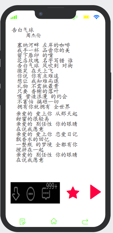 由歌单,歌词,播放按键,弹幕,下载组成,可收藏