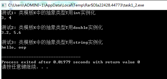 1 #include <iostream> 2 3 using std::cout; 4 using std::endl; 5 6 // 类A的定义 7 class A { 8 public: 9 A(int x0, int y0); 10 void display() const; 11 12 private: 13 int x, y; 14 }; 15 16 A::A(int x0, int y0): x{x0}, y{y0} { 17 } 18 19 void A::display() const { 20 cout << x << ", " << y << endl; 21 } 22 23 // 类B的定义 24 class B { 25 public: 26 B(double x0, double y0); 27 void display() const; 28 29 private: 30 double x, y; 31 }; 32 33 B::B(double x0, double y0): x{x0}, y{y0} { 34 } 35 36 void B::display() const { 37 cout << x << ", " << y << endl; 38 } 39 40 void test() { 41 cout << "测试类A: " << endl; 42 A a(3, 4); 43 a.display(); 44 45 cout << "\n测试类B: " << endl; 46 B b(3.2, 5.6); 47 b.display(); 48 } 49 50 int main() { 51 test(); 52 } 53 54 55 56 #include <iostream> 57 #include <string> 58 59 using std::cout; 60 using std::endl; 61 using std::string; 62 63 // 定义类模板 64 template<typename T> 65 class X{ 66 public: 67 X(T x0, T y0); 68 void display(); 69 70 private: 71 T x, y; 72 }; 73 74 template<typename T> 75 X<T>::X(T x0, T y0): x{x0}, y{y0} { 76 } 77 78 template<typename T> 79 void X<T>::display() { 80 cout << x << ", " << y << endl; 81 } 82 83 84 void test() { 85 cout << "测试1: 类模板X中的抽象类型T用int实例化" << endl; 86 X<int> x1(3, 4); 87 x1.display(); 88 89 cout << endl; 90 91 cout << "测试2: 类模板X中的抽象类型T用double实例化" << endl; 92 X<double> x2(3.2, 5.6); 93 x2.display(); 94 95 cout << endl; 96 97 cout << "测试3: 类模板X中的抽象类型T用string实例化" << endl; 98 X<string> x3("hello", "oop"); 99 x3.display(); 100 } 101 102 int main() { 103 test(); 104 }