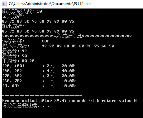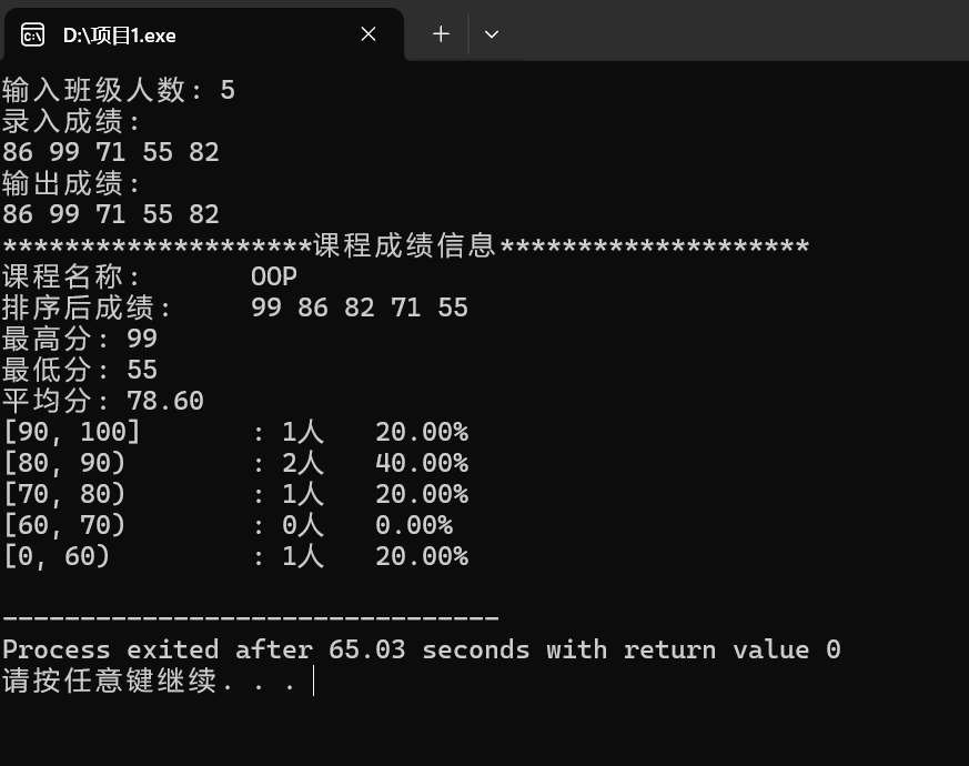 1 #include "GradeCalc.hpp" 2 #include <iomanip> 3 4 void test() { 5 int n; 6 cout << "输入班级人数: "; 7 cin >> n; 8 9 GradeCalc c1("OOP", n); 10 11 cout << "录入成绩: " << endl;; 12 c1.input(); 13 cout << "输出成绩: " << endl; 14 c1.output(); 15 16 cout << string(20, '*') + "课程成绩信息" + string(20, '*') << endl; 17 c1.info(); 18 } 19 20 int main() { 21 test(); 22 } 23 24 25 26 27 #include <iostream> 28 #include <vector> 29 #include <string> 30 #include <algorithm> 31 #include <numeric> 32 #include <iomanip> 33 34 using std::vector; 35 using std::string; 36 using std::cin; 37 using std::cout; 38 using std::endl; 39 40 class GradeCalc { 41 public: 42 GradeCalc(const string &cname, int size); 43 void input(); // 录入成绩 44 void output() const; // 输出成绩 45 void sort(bool ascending = false); // 排序 (默认降序) 46 int min() const; // 返回最低分 47 int max() const; // 返回最高分 48 float average() const; // 返回平均分 49 void info(); // 输出课程成绩信息 50 51 private: 52 void compute(); // 成绩统计 53 54 private: 55 string course_name; // 课程名 56 int n; // 课程人数 57 vector<int> grades; // 课程成绩 58 vector<int> counts = vector<int>(5, 0); // 保存各分数段人数([0, 60), [60, 70), [70, 80), [80, 90), [90, 100] 59 vector<double> rates = vector<double>(5, 0); // 保存各分数段比例 60 }; 61 62 GradeCalc::GradeCalc(const string &cname, int size): course_name{cname}, n{size} {} 63 64 void GradeCalc::input() { 65 int grade; 66 67 for(int i = 0; i < n; ++i) { 68 cin >> grade; 69 grades.push_back(grade); 70 } 71 } 72 73 void GradeCalc::output() const { 74 for(int grade: grades) 75 cout << grade << " "; 76 cout << endl; 77 } 78 79 void GradeCalc::sort(bool ascending) { 80 if(ascending) 81 std::sort(grades.begin(), grades.end()); 82 else 83 std::sort(grades.begin(), grades.end(), std::greater<int>()); 84 85 } 86 87 int GradeCalc::min() const { 88 return *std::min_element(grades.begin(), grades.end()); 89 } 90 91 int GradeCalc::max() const { 92 return *std::max_element(grades.begin(), grades.end()); 93 } 94 95 float GradeCalc::average() const { 96 return std::accumulate(grades.begin(), grades.end(), 0) * 1.0 / n; 97 } 98 99 void GradeCalc::compute() { 100 for(int grade: grades) { 101 if(grade < 60) 102 counts.at(0)++; 103 else if(grade >= 60 && grade < 70) 104 counts.at(1)++; 105 else if(grade >= 70 && grade < 80) 106 counts.at(2)++; 107 else if(grade >= 80 && grade < 90) 108 counts.at(3)++; 109 else if(grade >= 90) 110 counts.at(4)++; 111 } 112 113 for(int i = 0; i < rates.size(); ++i) 114 rates.at(i) = counts.at(i) *1.0 / n; 115 } 116 117 void GradeCalc::info() { 118 cout << "课程名称:\t" << course_name << endl; 119 cout << "排序后成绩: \t"; 120 sort(); output(); 121 cout << "最高分:\t" << max() << endl; 122 cout << "最低分:\t" << min() << endl; 123 cout << "平均分:\t" << std::fixed << std::setprecision(2) << average() << endl; 124 125 compute(); // 统计各分数段人数、比例 126 127 vector<string> tmp{"[0, 60) ", "[60, 70)", "[70, 80)","[80, 90)", "[90, 100]"}; 128 for(int i = tmp.size()-1; i >= 0; --i) 129 cout << tmp[i] << "\t: " << counts[i] << "人\t" 130 << std::fixed << std::setprecision(2) << rates[i]*100 << "%" << endl; 131 }