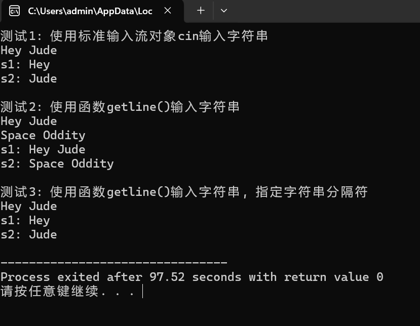 1 #include <iostream> 2 #include <string> 3 #include <limits> 4 5 using namespace std; 6 7 void test1() { 8 string s1, s2; 9 cin >> s1 >> s2; // cin: 从输入流读取字符串, 碰到空白符(空格/回车/Tab)即结束 10 cout << "s1: " << s1 << endl; 11 cout << "s2: " << s2 << endl; 12 } 13 14 void test2() { 15 string s1, s2; 16 getline(cin, s1); // getline(): 从输入流中提取字符串,直到遇到换行符 17 getline(cin, s2); 18 cout << "s1: " << s1 << endl; 19 cout << "s2: " << s2 << endl; 20 } 21 22 void test3() { 23 string s1, s2; 24 getline(cin, s1, ' '); //从输入流中提取字符串,直到遇到指定分隔符 25 getline(cin, s2); 26 cout << "s1: " << s1 << endl; 27 cout << "s2: " << s2 << endl; 28 } 29 30 int main() { 31 cout << "测试1: 使用标准输入流对象cin输入字符串" << endl; 32 test1(); 33 cout << endl; 34 35 cin.ignore(numeric_limits<streamsize>::max(), '\n'); 36 37 cout << "测试2: 使用函数getline()输入字符串" << endl; 38 test2(); 39 cout << endl; 40 41 cout << "测试3: 使用函数getline()输入字符串, 指定字符串分隔符" << endl; 42 test3(); 43 }