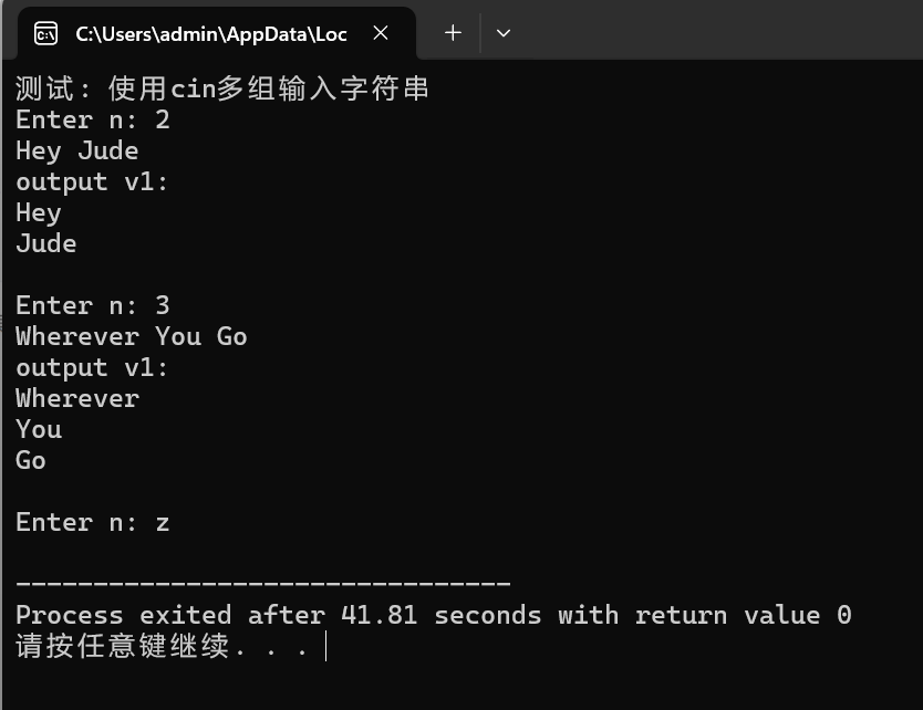 1 #include <iostream> 2 #include <string> 3 #include <vector> 4 #include <limits> 5 6 using namespace std; 7 8 void output(const vector<string> &v) { 9 for(auto &s: v) 10 cout << s << endl; 11 } 12 13 void test() { 14 int n; 15 while(cout << "Enter n: ", cin >> n) { 16 vector<string> v1; 17 18 for(int i = 0; i < n; ++i) { 19 string s; 20 cin >> s; 21 v1.push_back(s); 22 } 23 24 cout << "output v1: " << endl; 25 output(v1); 26 cout << endl; 27 } 28 } 29 30 int main() { 31 cout << "测试: 使用cin多组输入字符串" << endl; 32 test(); 33 }