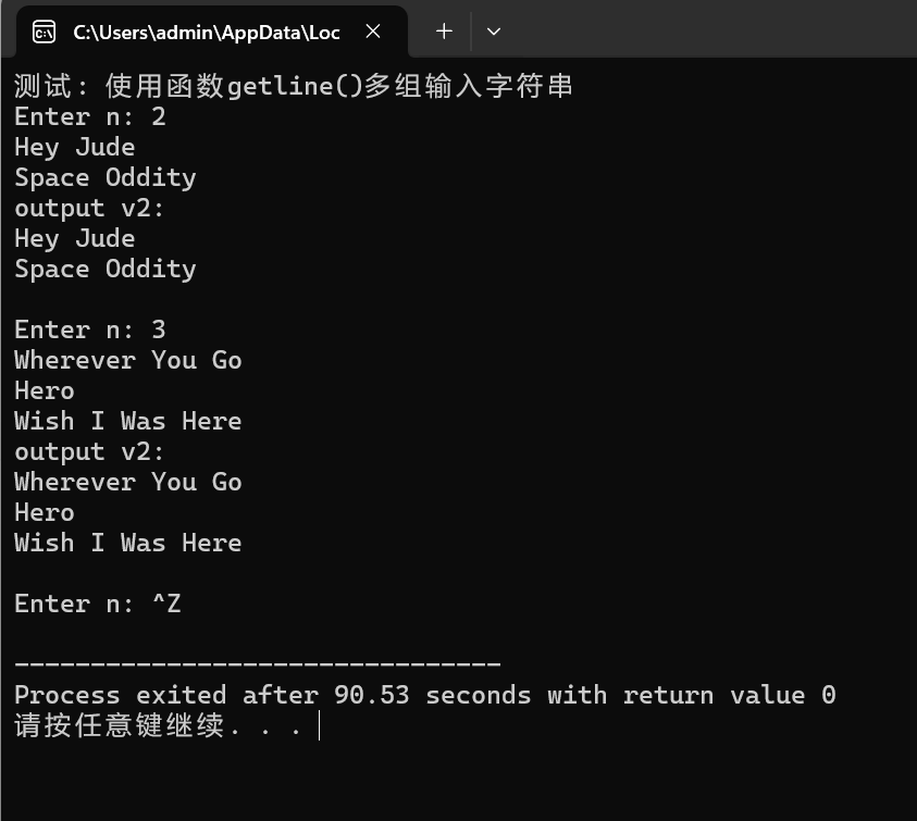 1 #include <iostream> 2 #include <string> 3 #include <vector> 4 #include <limits> 5 6 using namespace std; 7 8 void output(const vector<string> &v) { 9 for(auto &s: v) 10 cout << s << endl; 11 } 12 13 void test() { 14 int n; 15 while(cout << "Enter n: ", cin >> n) { 16 cin.ignore(numeric_limits<streamsize>::max(), '\n'); 17 18 vector<string> v2; 19 20 for(int i = 0; i < n; ++i) { 21 string s; 22 getline(cin, s); 23 v2.push_back(s); 24 } 25 cout << "output v2: " << endl; 26 output(v2); 27 cout << endl; 28 } 29 } 30 31 int main() { 32 cout << "测试: 使用函数getline()多组输入字符串" << endl; 33 test(); 34 }