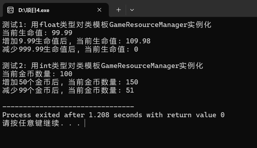1 #ifndef GRM_HPP 2 #define GRM_HPP 3 4 template <typename T> 5 class GameResourceManager { 6 private: 7 T resource; 8 9 public: 10 GameResourceManager(T initialResource) : resource(initialResource) {} 11 12 T get() const { 13 return resource; 14 } 15 16 void update(T amount) { 17 resource += amount; 18 if (resource < 0) { 19 resource = 0; 20 } 21 } 22 }; 23 24 #endif 25 26 27 28 #include "grm.hpp" 29 #include <iostream> 30 31 using std::cout; 32 using std::endl; 33 34 void test1() { 35 GameResourceManager<float> HP_manager(99.99); 36 cout << "当前生命值: " << HP_manager.get() << endl; 37 HP_manager.update(9.99); 38 cout << "增加9.99生命值后, 当前生命值: " << HP_manager.get() << endl; 39 HP_manager.update(-999.99); 40 cout <<"减少999.99生命值后, 当前生命值: " << HP_manager.get() << endl; 41 } 42 43 void test2() { 44 GameResourceManager<int> Gold_manager(100); 45 cout << "当前金币数量: " << Gold_manager.get() << endl; 46 Gold_manager.update(50); 47 cout << "增加50个金币后, 当前金币数量: " << Gold_manager.get() << endl; 48 Gold_manager.update(-99); 49 cout <<"减少99个金币后, 当前金币数量: " << Gold_manager.get() << endl; 50 } 51 52 53 int main() { 54 cout << "测试1: 用float类型对类模板GameResourceManager实例化" << endl; 55 test1(); 56 cout << endl; 57 58 cout << "测试2: 用int类型对类模板GameResourceManager实例化" << endl; 59 test2(); 60 }