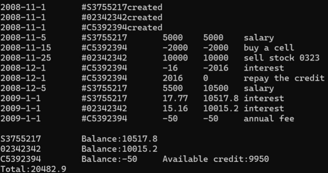 1 #ifndef __DATE_H__ 2 #define __DATE_H__ 3 class Date{ 4 private: 5 int year; 6 int month; 7 int day; 8 int totalDays; 9 public: 10 Date(int year,int month,int day); 11 int getYear() const {return year;} 12 int getMonth() const {return month;} 13 int getDay() const {return day;} 14 int getMaxDay() const; 15 bool isLeapYear() const { 16 return year%4==0 && year%100 !=0 ||year%400==0; 17 } 18 void show() const; 19 20 int distance(const Date& date) const { 21 return totalDays-date.totalDays; 22 } 23 }; 24 #endif //__DATE_H__ 25 26 #include "date.h" 27 #include <iostream> 28 #include <cstdlib> 29 using namespace std; 30 namespace { 31 const int DAYS_BEFORE_MONTH[]={0,31,59,90,120,151,181,212,243,273,304,334,365}; 32 } 33 Date::Date(int year,int month,int day):year(year),month(month),day(day) { 34 if(day<=0||day>getMaxDay()) { 35 cout<<"Invalid date:"; 36 show(); 37 cout<<endl; 38 exit(1); 39 } 40 int years=year-1; 41 totalDays = years *365+years/4-years/100+years/400+DAYS_BEFORE_MONTH[month-1]+day; 42 if(isLeapYear()&&month>2) totalDays++; 43 } 44 45 int Date::getMaxDay() const { 46 if(isLeapYear()&&month==2) 47 return 29; 48 else 49 return DAYS_BEFORE_MONTH[month]-DAYS_BEFORE_MONTH[month-1]; 50 } 51 52 void Date::show() const { 53 cout<<getYear()<<"-"<<getMonth()<<"-"<<getDay(); 54 } 55 56 #pragma once 57 #ifndef ACCOUNT H 58 #define ACCOUNT H 59 #include"date.h" 60 #include"accumulator.h" 61 #include<string> 62 class Account { 63 private: 64 std::string id; 65 double balance; 66 static double total; 67 protected: 68 Account(const Date& date, const std::string& id); 69 void record(const Date& date, double amount, const std::string& desc); 70 void error(const std::string& msg)const; 71 public: 72 const std::string& getId()const { return id; } 73 double getBalance()const { return balance; } 74 static double getTotal() { return total; } 75 76 void show()const; 77 }; 78 class SavingsAccount :public Account { 79 private: 80 Accumulator acc; 81 double rate; 82 public: 83 SavingsAccount(const Date& date, const std::string& id, double rate); 84 double getRate()const { return rate; } 85 86 void deposit(const Date& date, double amount, const std::string& desc); 87 void withdraw(const Date& date, double amount, const std::string& desc); 88 void settle(const Date& date); 89 }; 90 class CreditAccount :public Account { 91 private: 92 Accumulator acc; 93 double credit; 94 double rate; 95 double fee; 96 double getDebt()const { 97 double balance = getBalance(); 98 return (balance < 0 ? balance : 0); 99 } 100 public: 101 CreditAccount(const Date& date, const std::string& id, double credit, double rate, double fee); 102 double getCredit()const { return credit; } 103 double getRate()const { return rate;} 104 double getAvailableCredit()const { 105 if (getBalance() < 0) 106 return credit + getBalance(); 107 else 108 return credit; 109 } 110 void deposit(const Date& date, double amount, const std::string& desc); 111 void withdraw(const Date& date, double amount, const std::string& desc); 112 void settle(const Date& date); 113 void show()const; 114 }; 115 #endif//ACCOUNT H 116 117 #pragma once 118 #ifndef ACCUMULATOR H 119 #define ACCUMULATOR H 120 #include"date.h" 121 class Accumulator { 122 private: 123 Date lastDate; 124 double value; 125 double sum; 126 public: 127 Accumulator(const Date& date, double value) :lastDate(date), value(value), sum{ 0 } { 128 } 129 130 double getSum(const Date& date)const { 131 return sum + value * date.distance(lastDate); 132 } 133 134 void change(const Date& date, double value) { 135 sum = getSum(date); 136 lastDate = date; this->value = value; 137 } 138 139 void reset(const Date& date, double value) { 140 lastDate = date; this->value = value; sum = 0; 141 } 142 }; 143 #endif//ACCUMULATOR H 144 145 #include"account.h" 146 #include<cmath> 147 #include<iostream> 148 using namespace std; 149 double Account::total = 0; 150 151 Account::Account(const Date& date, const string& id) :id{ id }, balance{ 0 } { 152 date.show(); cout << "\t#" << id << "created" << endl; 153 } 154 155 156 void Account::record(const Date& date, double amount, const string& desc) { 157 amount = floor(amount * 100 + 0.5) / 100; 158 balance += amount; 159 total += amount; 160 date.show(); 161 cout << "\t#" << id << "\t" << amount << "\t" << balance << "\t" << desc << endl; 162 } 163 164 void Account::show()const { cout << id << "\tBalance:" << balance; } 165 void Account::error(const string& msg)const { 166 cout << "Error(#" << id << "):" << msg << endl; 167 } 168 169 SavingsAccount::SavingsAccount(const Date& date, const string& id, double rate) :Account(date, id), rate(rate), acc(date, 0) {} 170 171 void SavingsAccount::deposit(const Date& date, double amount, const string& desc) { 172 record(date, amount, desc); 173 acc.change(date, getBalance()); 174 } 175 176 void SavingsAccount::withdraw(const Date& date, double amount, const string& desc) { 177 if (amount > getBalance()) { 178 error("not enough money"); 179 } 180 else { 181 record(date, -amount, desc); 182 acc.change(date, getBalance()); 183 } 184 } 185 186 void SavingsAccount::settle(const Date& date) { 187 double interest = acc.getSum(date) * rate / date.distance(Date(date.getYear() - 1, 1, 1)); 188 if (interest != 0)record(date, interest, "interest"); 189 acc.reset(date, getBalance()); 190 } 191 192 CreditAccount::CreditAccount(const Date& date, const string& id, double credit, double rate, double fee) :Account(date, id), credit(credit), rate(rate), fee(fee), acc(date, 0) {} 193 194 void CreditAccount::deposit(const Date& date, double amount, const string& desc) { 195 record(date, amount, desc); 196 acc.change(date, getDebt()); 197 } 198 199 void CreditAccount::withdraw(const Date& date, double amount, const string& desc) { 200 if (amount - getBalance() > credit) { 201 error("not enough credit"); 202 } 203 else { 204 record(date, -amount, desc); 205 acc.change(date, getDebt()); 206 } 207 } 208 209 void CreditAccount::settle(const Date& date) { 210 doubl