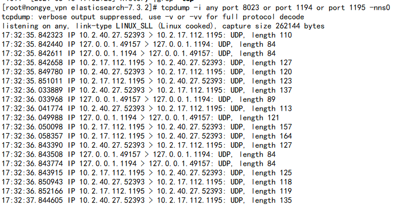 tcpdump -i any port 8023 or port 1194 or port 1195 -nns0
