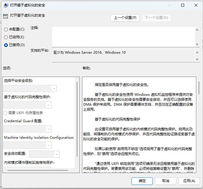 3、重复步骤 二、4,将“打开基于虚拟化的安全”项目重新设置为“未配置”。