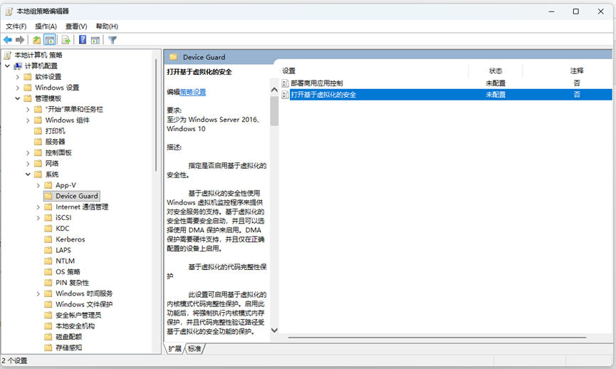 4、依次点击 计算机配置 -- 管理模板 -- 系统 -- Device Guard,双击“打开基于虚拟化的安全”项目。