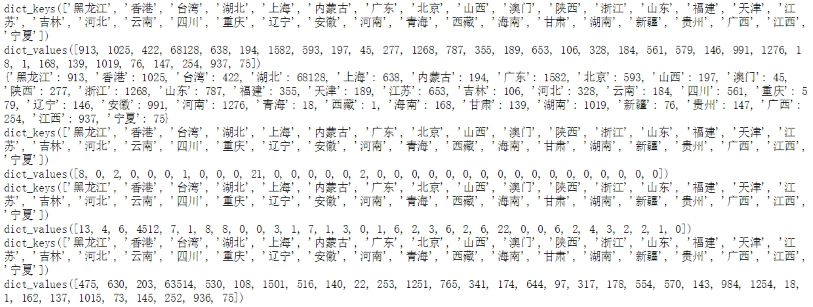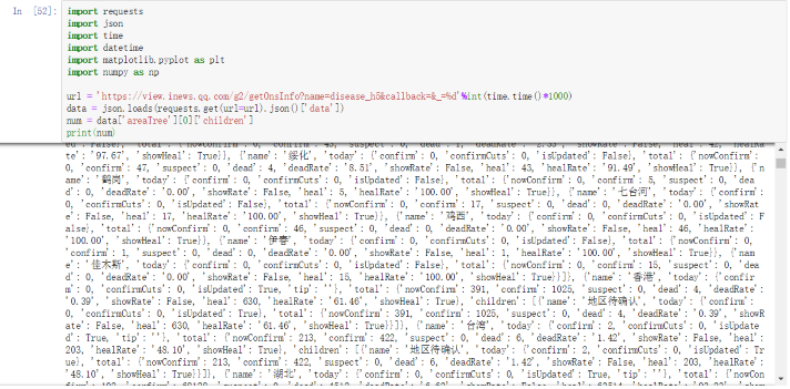 import requests import json import time import datetime import matplotlib.pyplot as plt import numpy as np url = 'https://view.inews.qq.com/g2/getOnsInfo?name=disease_h5&callback=&_=%d'%int(time.time()*1000) data = json.loads(requests.get(url=url).json()['data']) num = data['areaTree'][0]['children']