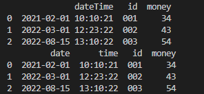 1 import pandas as pd 2 df = pd.DataFrame({'dateTime':['2021-02-01 10:10:21','2022-03-01 12:23:22','2022-08-15 13:10:22'],'id':['001','002','003'],'money':[34,43,54]}) 3 print(df) 4 df['date'] = df['dateTime'].map(lambda x:x.split(' ')[0]) 5 df['time'] = df['dateTime'].map(lambda x:x.split(' ')[1]) 6 df = df[['date','time','id','money']] 7 print(df)