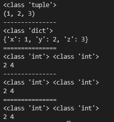 1 def fun1(*parameter): 2 print(type(parameter)) 3 print(parameter) 4 5 def fun2(**parameter): 6 print(type(parameter)) 7 print(parameter) 8 9 def fun3(a,b): 10 print(type(a),type(b)) 11 print(a,b) 12 13 fun1(1,2,3) 14 print('---------------') 15 fun2(x=1,y=2,z=3) 16 print('===============') 17 tuple1 = (2,4) 18 list1 = [2,4] 19 dict1 = {'a':2,'b':4} 20 fun3(*tuple1) 21 print('---------------') 22 fun3(*list1) 23 print('===============') 24 fun3(**dict1)