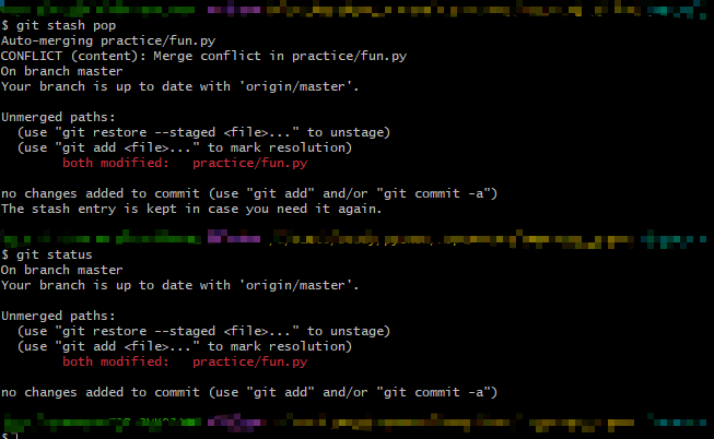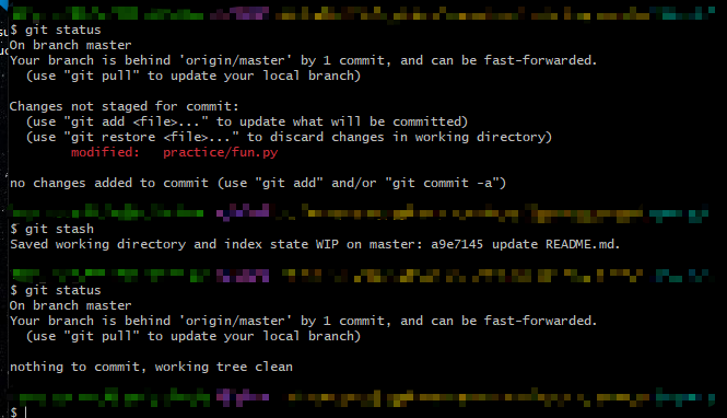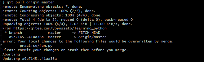 git pull 拉代码冲突提示“error: Your local changes to the following files would be overwritten by merge: practice/fun.py Please commit your changes or stash them before you merge.”