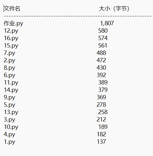 f.write(f"{'文件名':<40}{'大小(字节)':>20}\n")