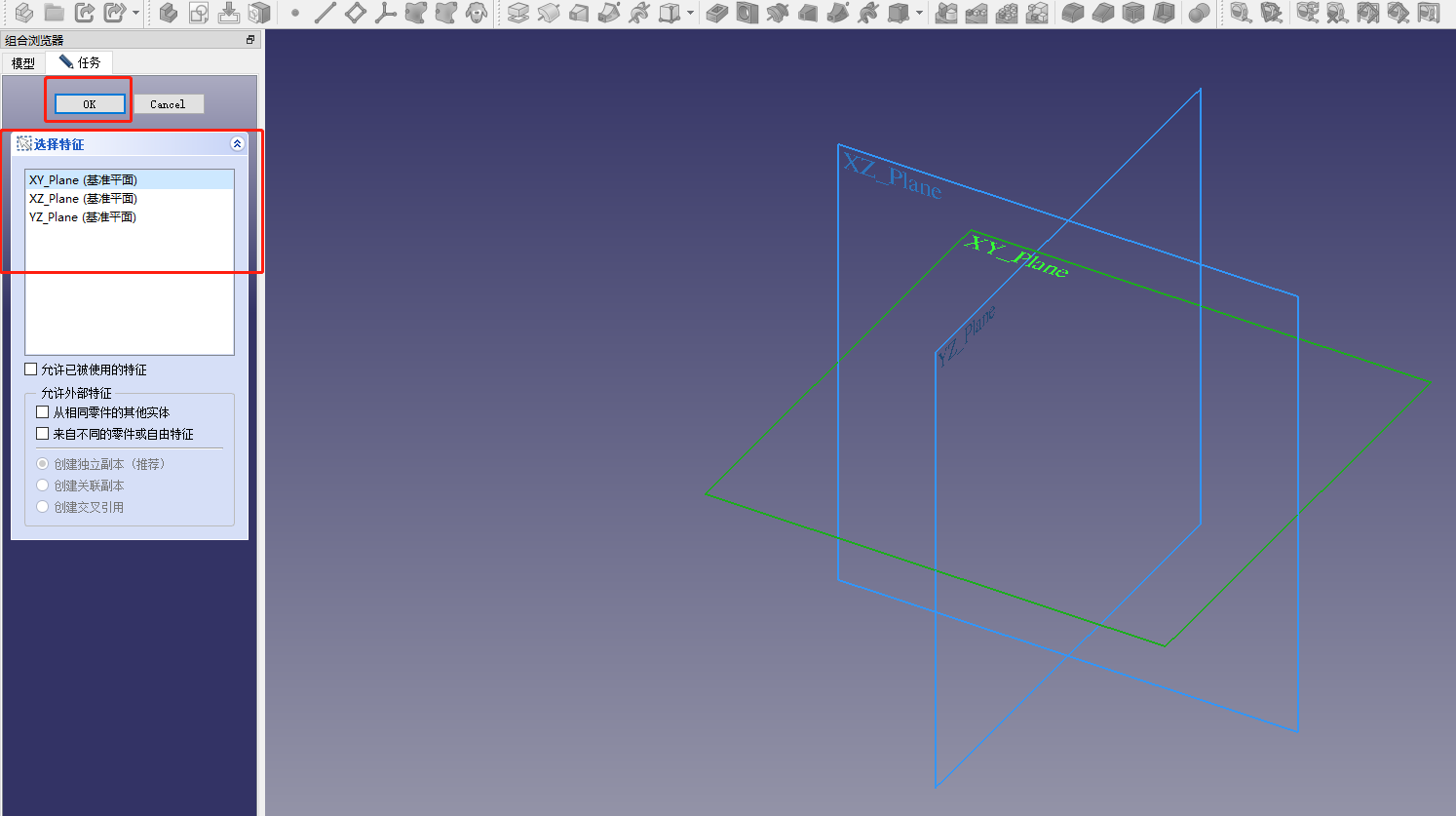 选择一个基准平面并点击“ok”或者直接双击某个基面,进入草绘工作台。