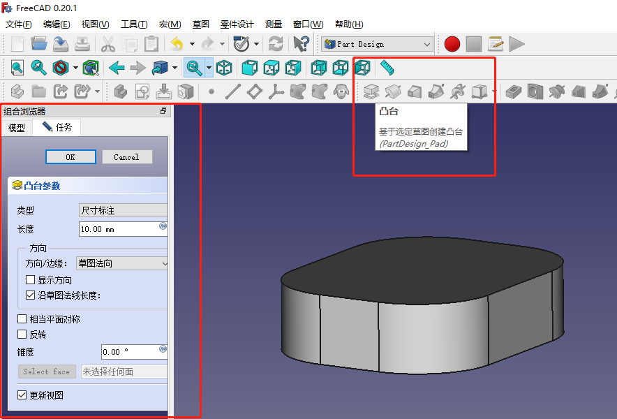 点击凸台PartDesign_Pad并在组合浏览器的任务栏进行凸台参数设置,“ok”完成凸台操作。此时,一个实体凸台就绘制完成了。