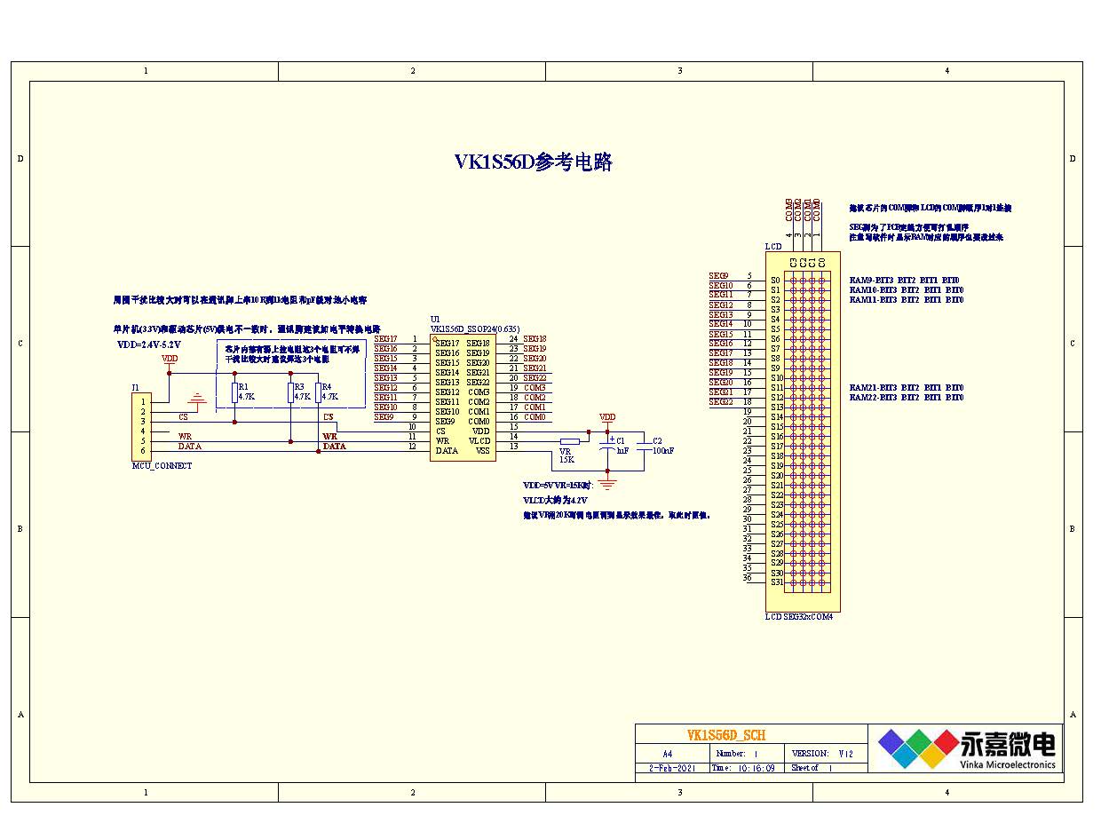VK1S56D SSOP24是一个点阵式存储映射的LCD驱动器,可支持最大56点(14SEGx4COM)的 LCD屏,也支持2COM和3COM的LCD屏。单片机可通过3个通信脚配置显示参数和发送显示 数据,也可通过指令进入省电模式。