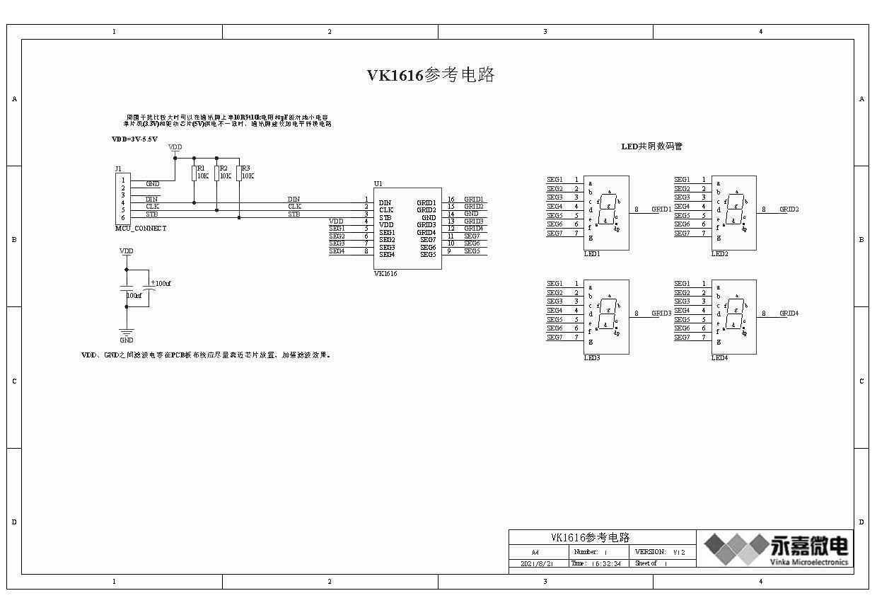 VK1616是一种数码管或点阵LED驱动控制专用芯片,内部集成有3线串行接口、数据锁存器、LED 驱动等电路。SEG脚接LED阳极,GRID脚接LED阴极,可支持7SEGx4GRID的点阵LED显示面板。采用SOP16/DIP16的封装形式。