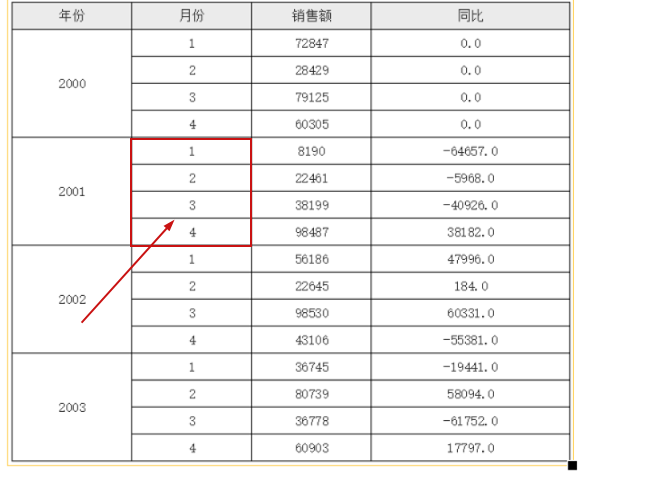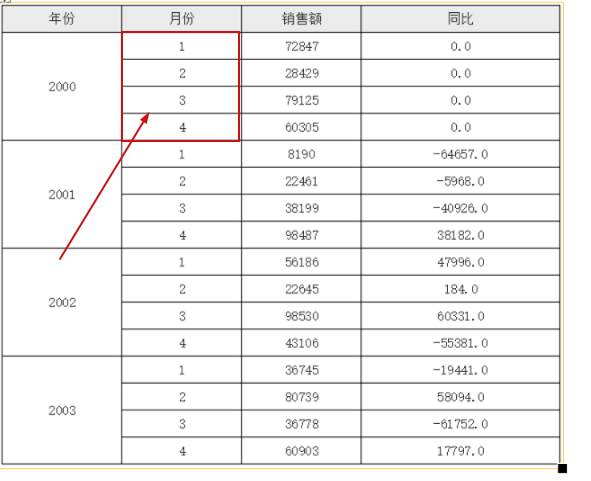 在上面的模版当中,D2 单元格中首先取到与其同行的 C2 单元格的值,然后利用单元格坐格,先取到当前 D2 单元格所在行的 A2 单元格的上一条 A2 单元格记录(-1表示坐标上移),然后再取这个 A2 下对应的 C2 单元格,但由于其下 C2 单元格还是有多个,所以这里加了个条件B2==$B2,这里的第一个 B2 表示当前单元格所在行对应的 B2 的值,$B2 表示坐标定位后(上一条A2单元格) C2 单元格对应的 B2 单元格的值,条件就是他们俩要相等,实际上就是月份相等,这样就达到了我们要实现的同比的目的,运行后的效果如下:
