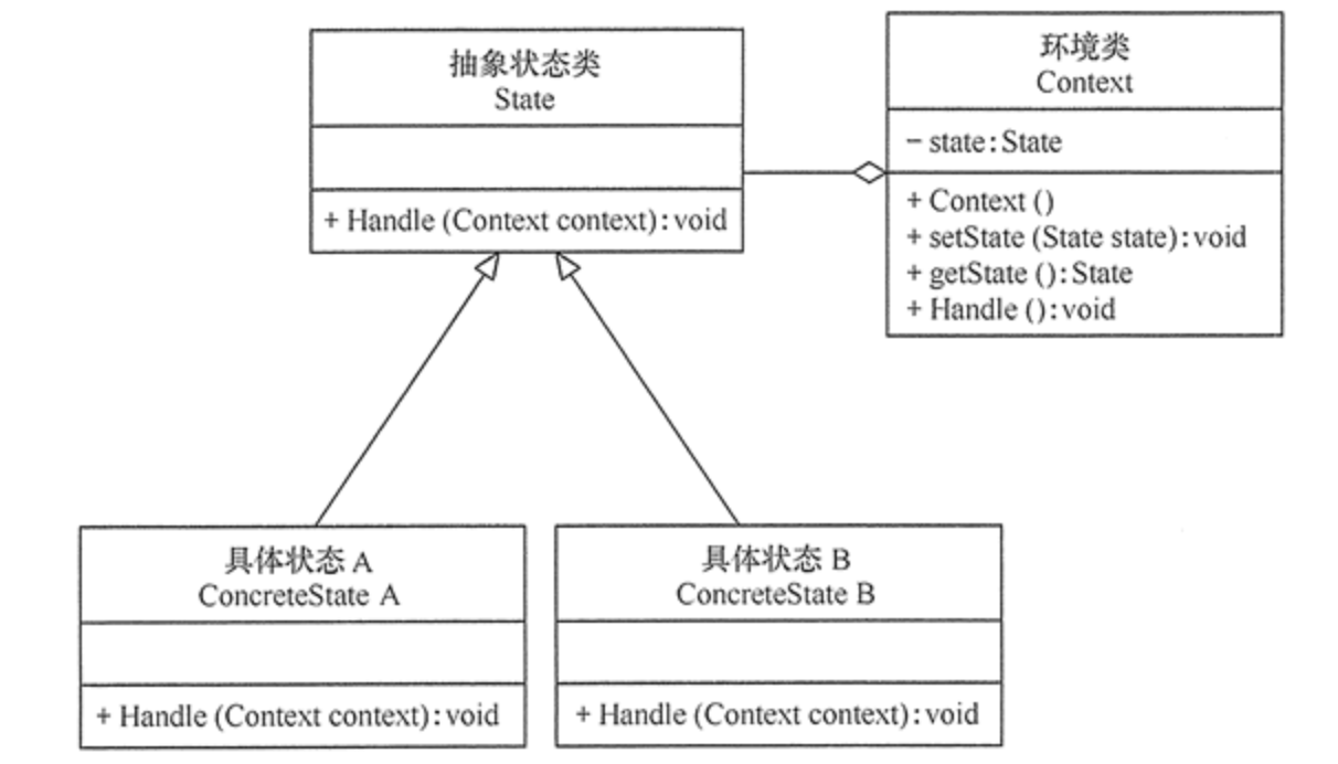 - 抽象状态(State)角色:定义一个接口,用以封装环境对象中的特定状态所对应的行为。
